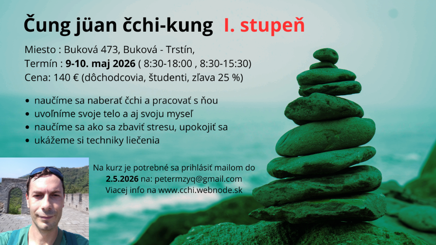 Chcete spoznať tajomstvo čchi? Naučíme sa "tajné" cviky na rozvoj a zvýšenie čchi. Kurz je určený pre ľudí, ktorí chcú byť zdraví a šťastní. Je to škola jednoduchých cvičení na sebarozvoj, a sebapoznávanie. Umožňuje nám rozvíjať sa a zlepšiť si svoju vitalitu a život. Systém je určený aj pre ľudí, ktorí sa chcú duchovne rozvíjať.